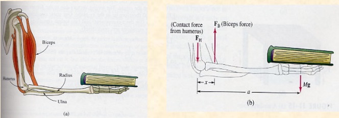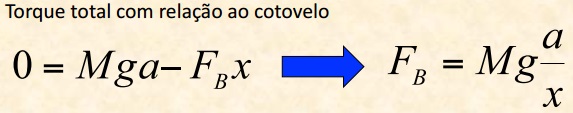 Os valores típicos para o tamanho do braço é de a = 30 cm e para a distância do bíceps ao cotovelo é de x = 4 cm. Se um livro de massa M é sustentado pela mão, qual seria a força feita pelo bíceps? Podemos desprezar o peso do braço se a massa for grande.
