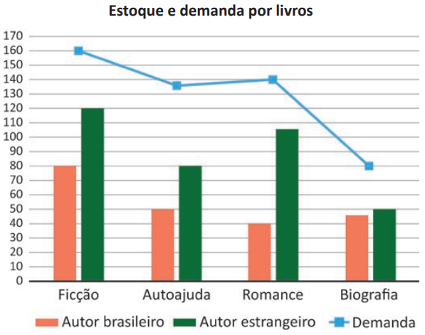 Uma livraria comercializa livros dos seguintes gêneros literários: ficção científica, autoajuda, romance e biografia. O gráfico apresenta o estoque dos livros que essa livraria tem, por gênero literário e por nacionalidade do autor, bem como a demanda por gênero literário, obtida por meio de uma enquete feita com seus clientes habituais.