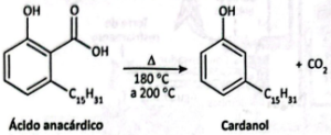 O fruto do cajueiro é um aquênio repleto de um líquido escuro, quase preto, cáustico e inflamável. Esse líquido da casca da castanha do caju (LCC) representa aproximadamente 25% da massa da castanha e é um subproduto de agronegócio do caju. Quando submetido a altas temperaturas, o ácido anacárdico presente no LCC é convertido a cardanol, que recebe a denominação de LCC técnico, conforme o esquema: